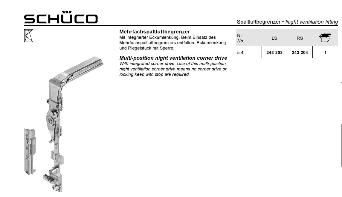 Schüco stūris ar regulējamu spraugu ventilācijai 243203 kreisais vai 243204 labais